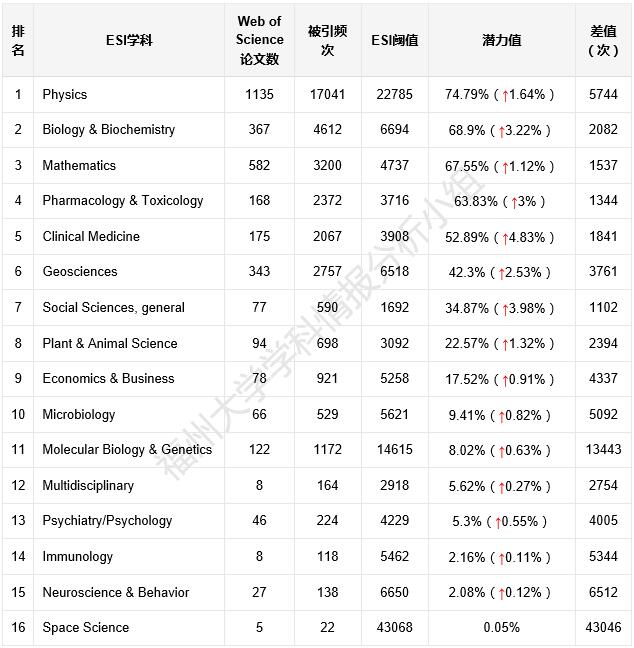 *注:1、Web of Science论文数和被引频次数据来源于InCites,ESI阈值数据来源于ESI。InCites更新时间2021年07月30日,统计时间跨度为2011年01月01日至 2021年06月30日;ESI更新时间2021年09月09日,统计时间跨度为2011年01月01日至 2021年06月30日。潜力值为被引频次占ESI阈值的百分比。2、表中的差值指的是福州大学被引频次与ESI学科阈值的差距。