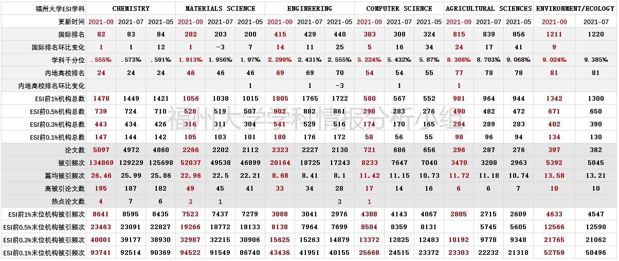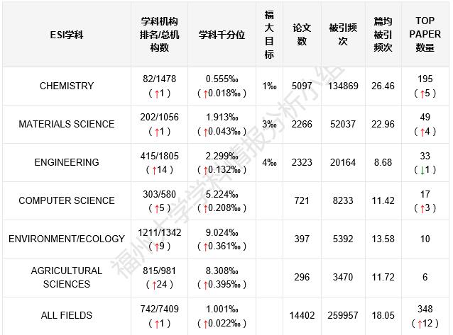 本期ESI数据显示,进入前1%的机构总数为7409,福州大学世界综合排名742位(与上一期数据相比,前进了1位),所处千分位为1.001‰,内地高校排名57位(与上一期数据相比,后退了1位)。福州大学论文总数为14402篇,总被引频次为259957次,篇均被引频次为18.05次/篇,高被引论文348篇(与上一期数据相比,增加了15篇)。福州大学有6个学科进入ESI前1%,分别是:化学、材料科学、工程学、计算机科学、农业科学和环境生态学,详见