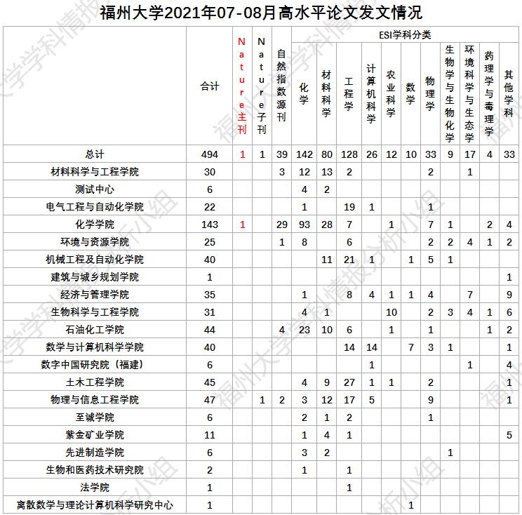 一、2021年07-08月我校有494篇高水平论文被收录,其中有39篇论文发表在自然指数源刊上, 1篇论文发表在Nature主刊上, 1篇论文发表在Nature子刊上。各学科论文收录情况统计如下: