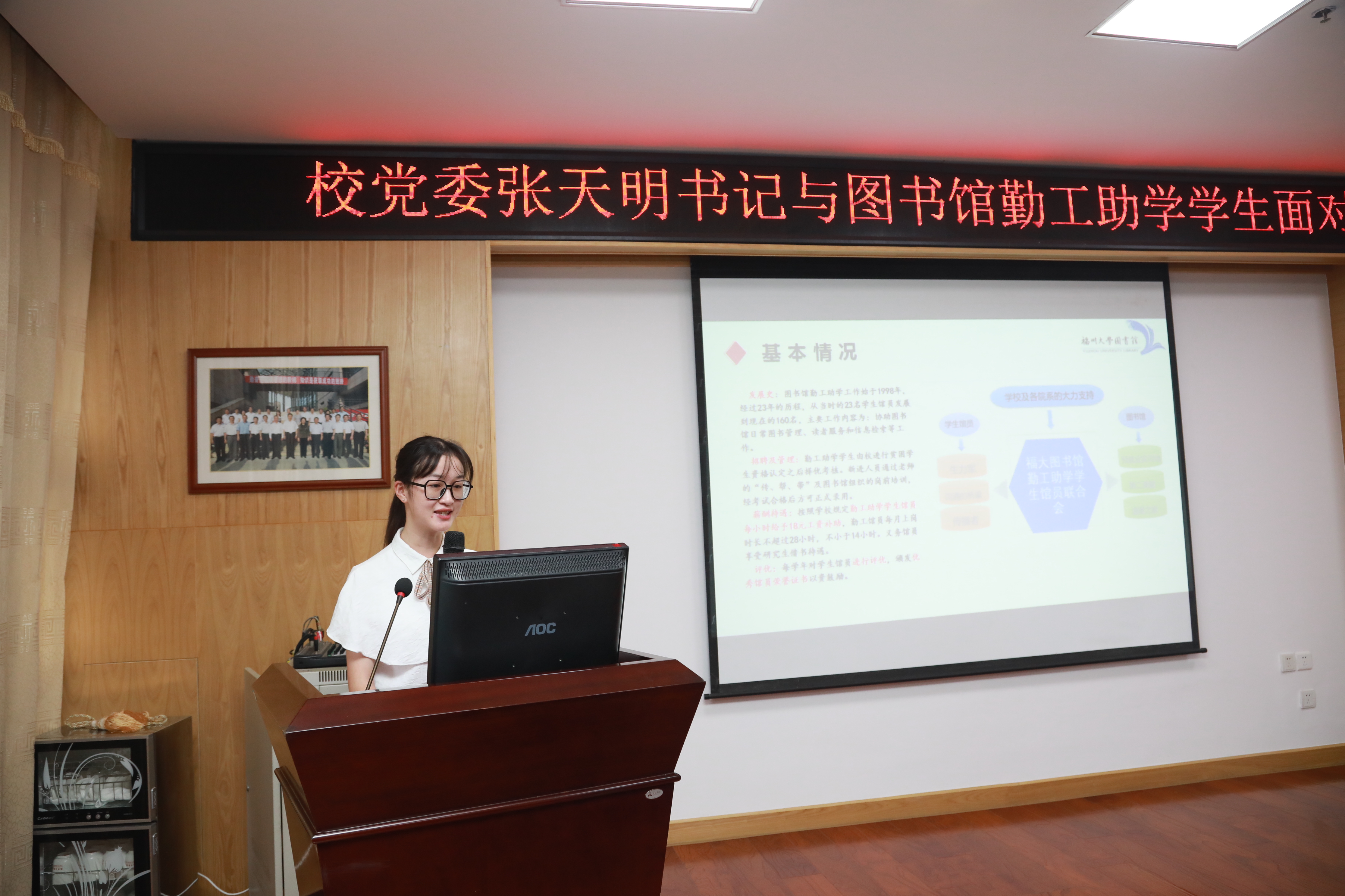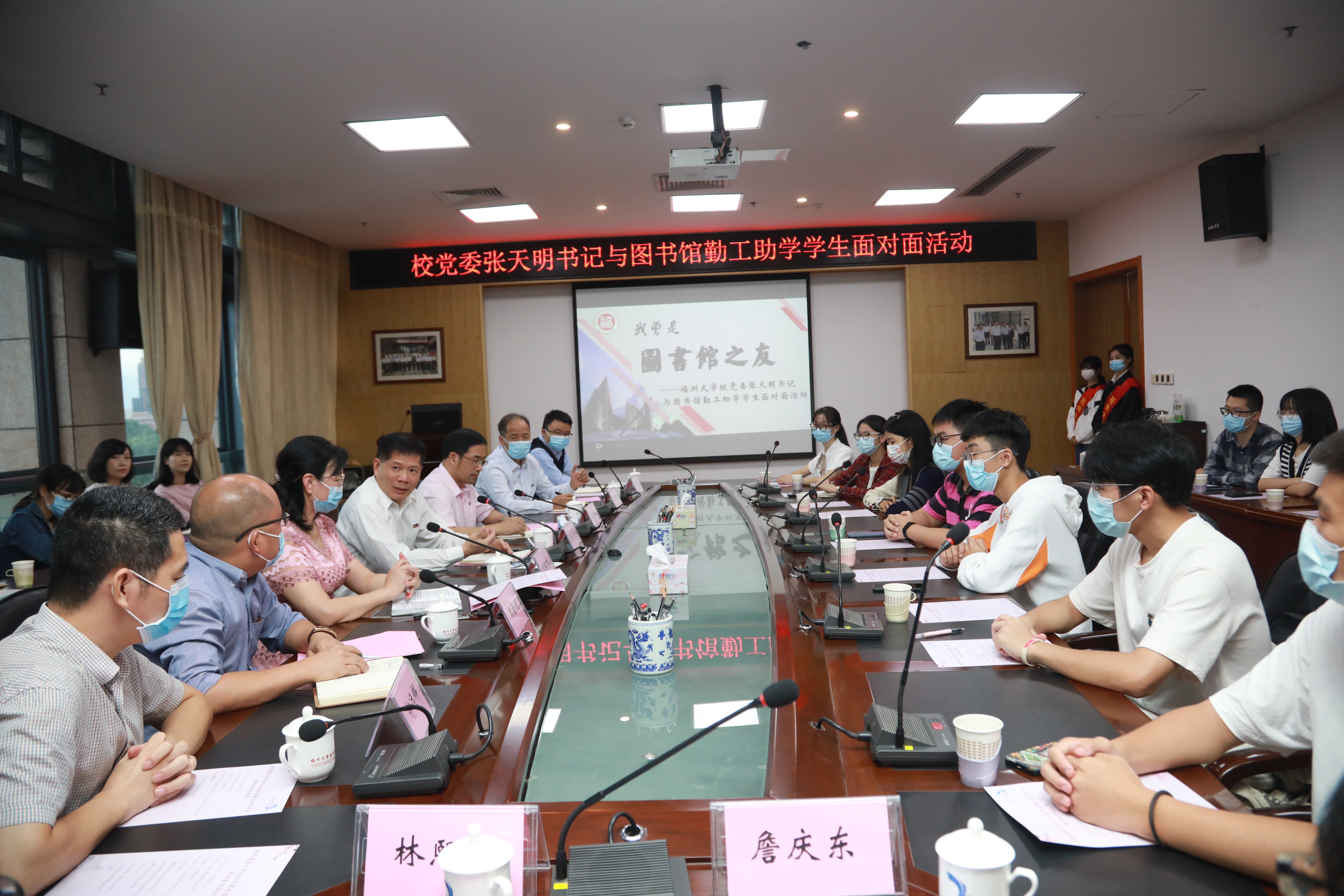 在观看了图书馆宣传片,听取了勤工助学学生副班长李璇同学和原图书馆勤工助学的学长化学学院郑远辉教授的汇报和分享后,张天明书记、林生副书记与同学们亲切交谈,详细了解勤工助学同学在校的学习、工作和生活情况,耐心解答同学们提出的问题。