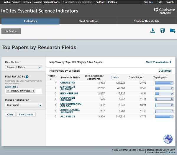 本期ESI数据显示,福州大学有六个学科进入ESI全球前1%,分别是化学、材料科学、工程学、计算机科学、农业科学和环境/生态学,其中环境/生态学是本期新增入围学科。环境/生态学学科进入ESI全球前1%的机构总数为1300,门槛值为4547,福州大学环境/生态学学科排名1220位,收录论文382篇,总被引次数5045次,学科千分位为9.384‰。国内共有90所高校的环境/生态学学科进入ESI全球前1%,福州大学和北京航空航天大学、河南大学、河南师范大学、华中师范大学、南京理工大学、扬州大学、郑州大学是本期新入围高校,福建省有四所高校的环境/生态学学科入围,分别是厦门大学、福州大学、福建农林大学、福建师范大学。