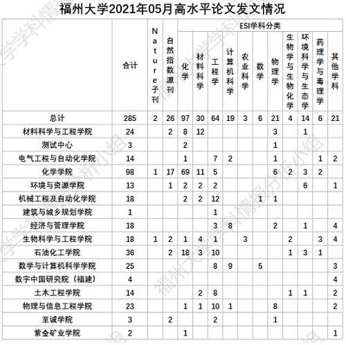 为了方便我校教学科研、科研管理等相关人员及时了解、跟踪本校高水平论文的收录情况,福州大学学科情报分析小组利用WoS数据库对近期作者单位为“福州大学”的论文进行了收集整理统计,更新时间为2021年06月01日。