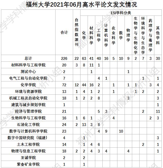 为了方便我校教学科研、科研管理等相关人员及时了解、跟踪本校高水平论文的收录情况,福州大学学科情报分析小组利用WoS数据库对近期作者单位为“福州大学”的论文进行了收集整理统计,更新时间为2021年07月01日。