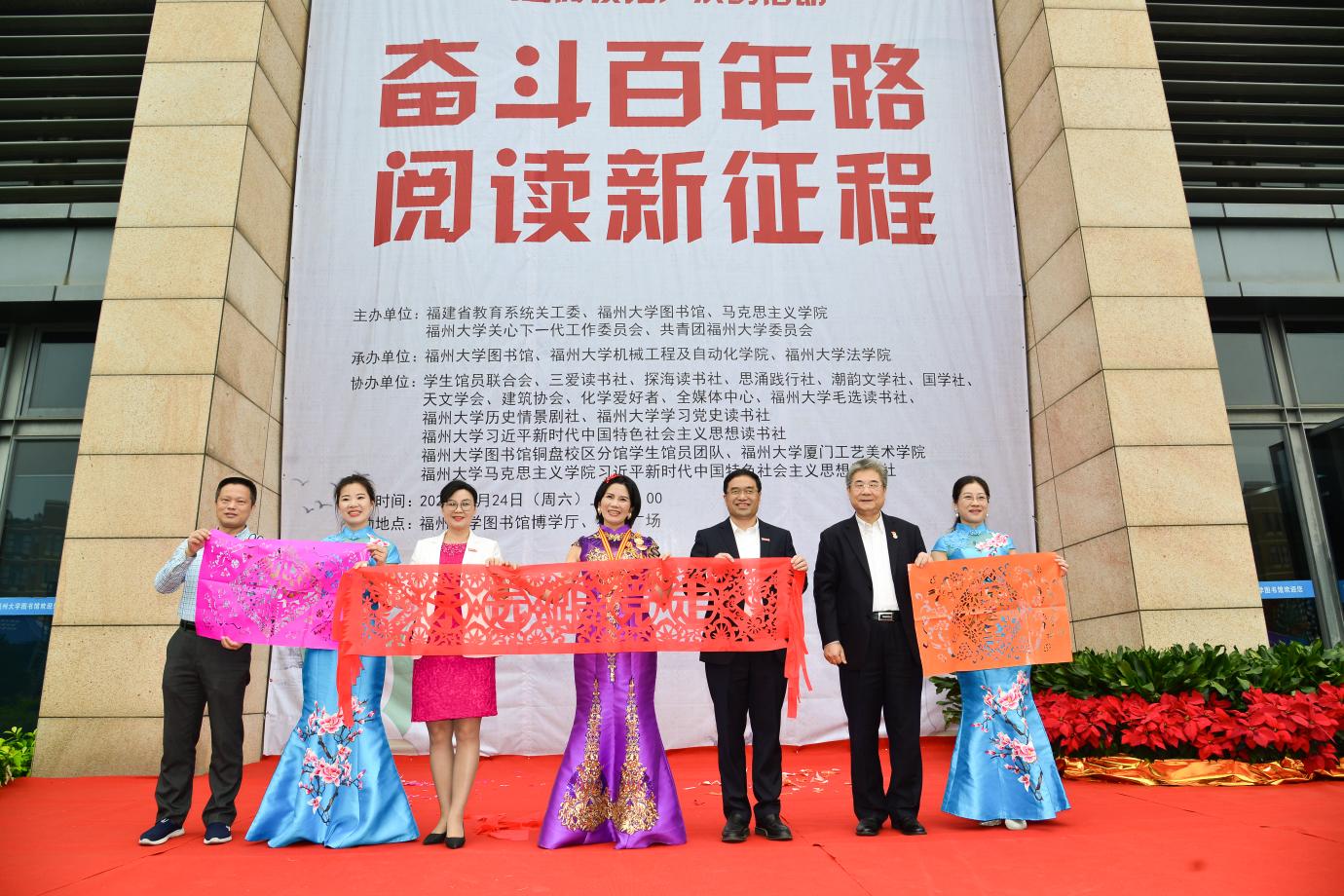 领导嘉宾张建光、林生、陈少平、陈晃为福州大学纪念建党100周年阅读主题书目推荐揭幕,丰富同学们的阅读选择。福州大学青年创业协会等通过赠书的方式大力支持阅读推广系列活动。之后校领导为福州大学借阅量优胜个人以及对阅读推广有贡献的优秀社团颁奖。颁奖结束后,领导嘉宾与获奖学生上台合影留念。