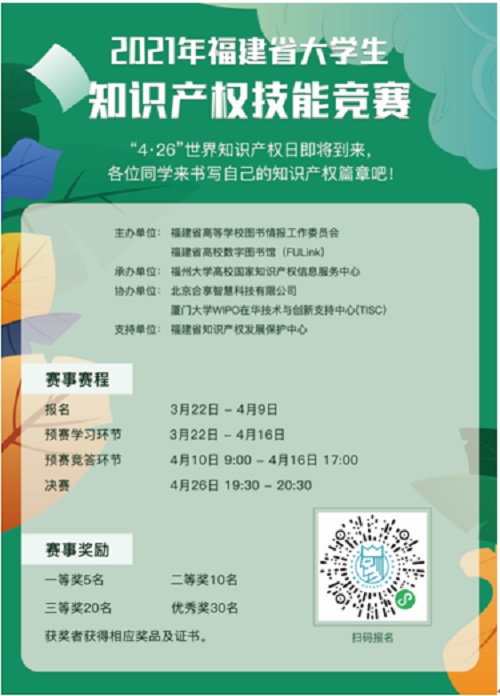 “全面加强知识产权保护,推动构建新发展格局”,以“4·26”世界知识产权日为契机,福州大学图书馆、高校国家知识产权信息服务中心积极开展知识产权宣传月活动,并于近日圆满收官。
