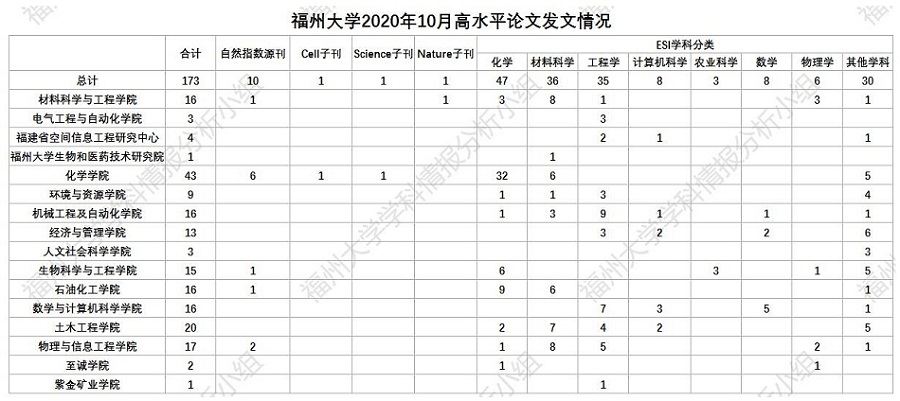 为了方便我校教学科研、科研管理等相关人员及时了解、跟踪本校高水平论文的收录情况,福州大学学科情报分析小组利用WoS数据库对近期作者单位为“福州大学”的论文进行了收集整理统计,更新时间为2020年11月1日。