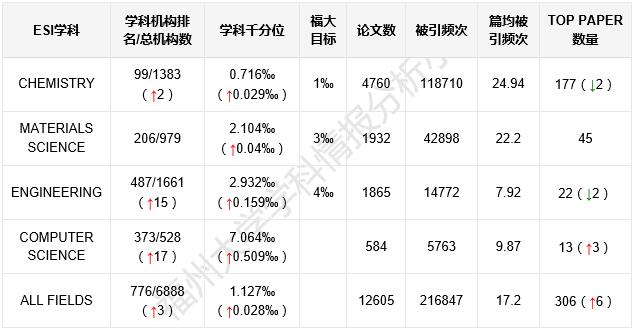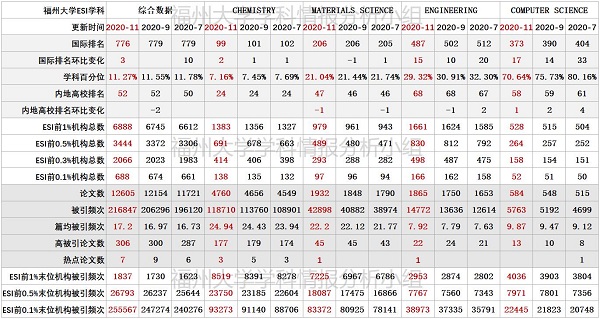 2020年11月24日,科睿唯安更新了ESI数据(2020年第6次更新,含10年8个月的收录论文及其引文信息)。此次数据涵盖的时间范围为2010年1月1日-2020年8月31日。 本期ESI数据显示,进入前1%的机构总数为6888,福州大学世界综合排名776位(与上一期数据相比,前进3位),所处千分位为1.127‰,内地高校排名52位。福州大学论文总数为12605篇,总被引频次为216847次,篇均被引频次为17.2次/篇,高水平论文306篇(与上一期数据相比,增加了6篇)。福州大学有4个学科进入ESI前1%,分别是:化学、材料科学、工程学、计算机科学,详见表1、表2。表1 福州大学ESI学科情况