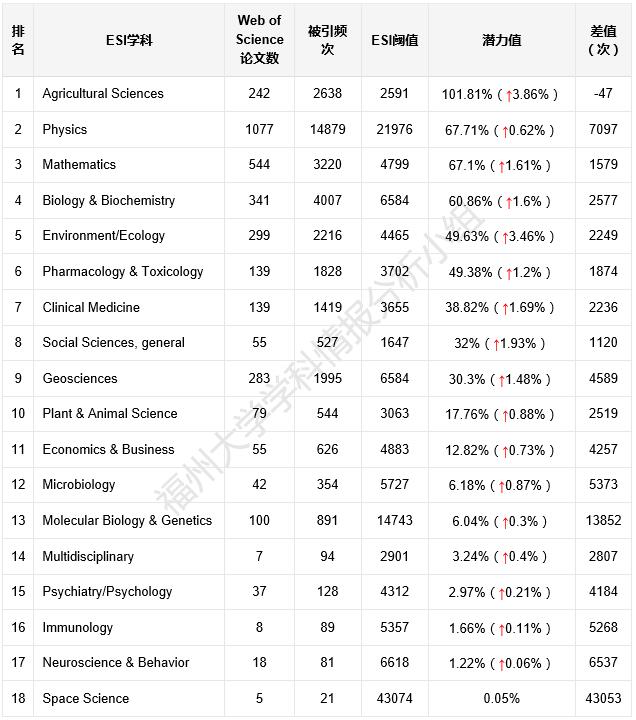 福州大学ESI潜力学科中,本期潜力值最高的是农业科学学科,达到101.81%,其次是物理学,排名第三是数学,详见表3。表3 福州大学ESI潜力学科情况