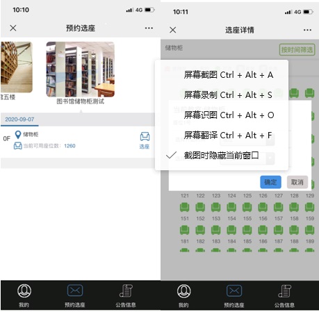 图书馆自修室存包柜系统于9月15日上午10:10--10:30再次开启预约,同学们可在福州大学图书馆微信公众号—资源&服务—空间服务—自修室座位预约系统预约,也可以通过自修室预约机预约,也可以通过网页(http://kjgl.fzu.edu.cn)在线预约。 温馨提示:1.一个学号只能预约一个存包柜。2.在预约存包柜之前当天不要进行座位预约,即在上午10:00之前不要有9月15日这天任何时段的预约记录,10:30之后可以进行当天自修室的座位预约。3.操作方法见门口示意图。4.存包柜10:30预约结束之后如果还有存包柜没有预约,我们会另行通知开放预约的时间。 福州大学图书馆 2020年9月11日预约流程示意图1.微信预约:10:10分进入系统,选择厂馆选择图书馆储物柜测试-à储物柜开始预约,选择一个可用的位置(绿色)的进行预约。
