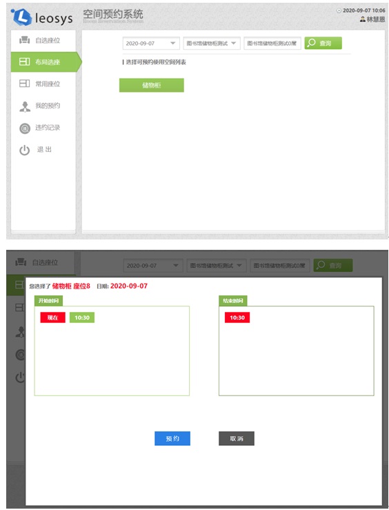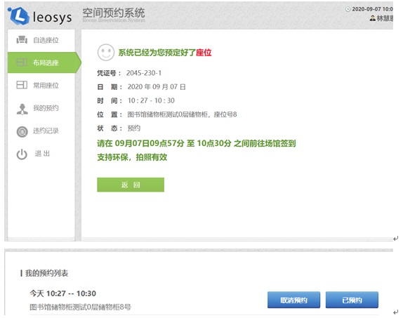2.网页预约流程:登录http://kjgl.fzu.edu.cn,输入借书证号、密码、验证码登录之后,时间选择2020-9-8号,厂馆选择图书馆储物柜测试,楼层选择图书馆储物柜测试0层,然后选择查询,点击储物柜进行座位选择。选择一个可用的座位,然后点击开始时间现在,结束时间10:30,点击预约,如果预约成功,会有预约凭证。同样在10:30之前请勿取消预约。