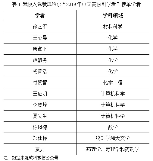 我校12位学者入选爱思唯尔2019年中国高被引学者榜单,入选人数并列内地高校第37位。2019年我校新增两位中国高被引学者,分别是唐点平(化学)和池毓务(化学),详见表1。