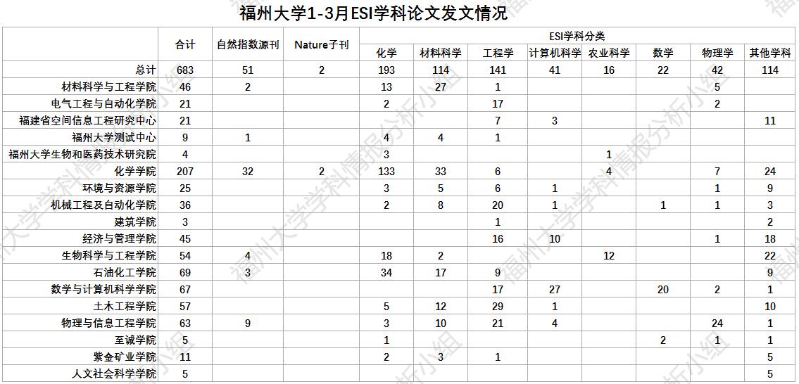 二、2020年1-3月各学院ESI学科论文新发文数量统计如下: