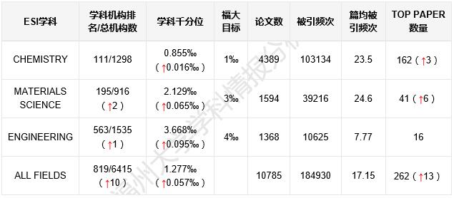 本期ESI数据显示,进入前1%的机构总数为6215,福州大学世界综合排名819位(与上一期数据相比,前进了10位),所处千分位为1.277‰,内地高校排名48位。福州大学论文总数为10785篇,总被引频次为184930次,篇均被引频次为17.15次/篇,内地高校排名第3名,仅次于辽宁工业大学和南开大学,高水平论文262篇(与上一期数据相比,增加了13篇)。依旧是3个学科进入ESI前1%,分别是:化学、材料科学、工程学,详见表1。