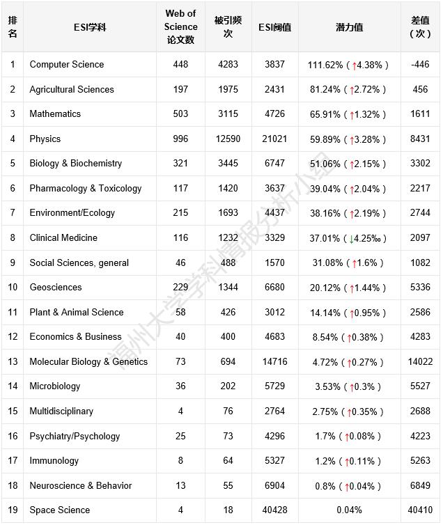 福州大学ESI潜力学科中,计算机科学潜力值最高,达到111.62%,其次是农业科学,排名第三是数学.