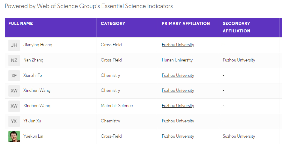 2019年11月19日,科睿唯安发布了全球“高被引科学家”(Highly Cited Researchers 2019)榜单,这也是该名单连续第六年发布。福州大学共有6位教师(7人次)入选该名单,位居省内高校第一,并列全国第22位。其中,付贤智院士、王心晨教授和徐艺军教授入选化学领域榜单,王心晨教授入选材料科学领域榜单,赖跃坤教授、黄剑莹博士和张楠博士后入选跨学科领域榜单。
