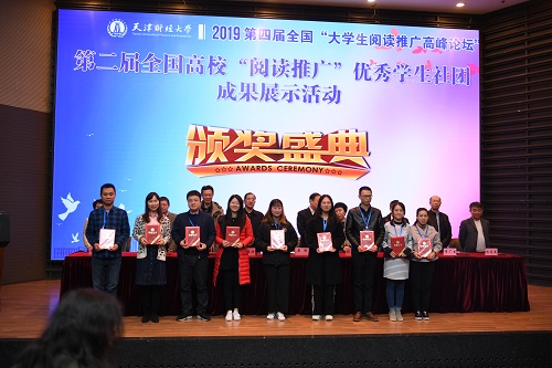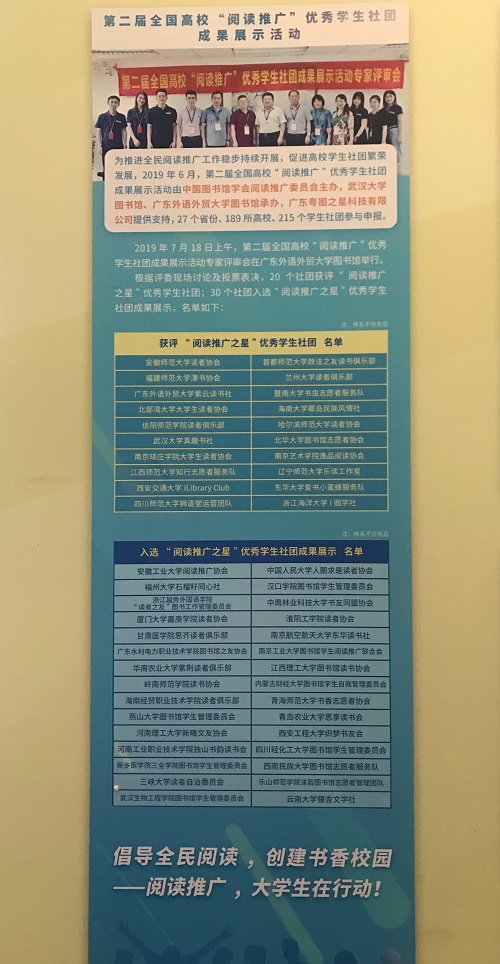 2019年11月14日上午,第二届全国高校“阅读推广”优秀学生社团成果展示活动在天津市财经大学图书馆举办。本活动由中国图书馆学会阅读推广委员会主办,武汉大学图书馆、广东外语外贸大学图书馆承办,旨在鼓励以阅读为主要活动内容的学生社团,促进高校学生社团繁荣发展,推进全民阅读推广工作稳步持续开展。