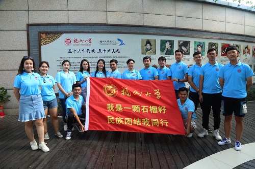 国庆节将至,福州大学刘敏榕工作室少数民族学生22日下午在图书馆月相园进行同唱《我和我的祖国》,共寄祝福语:“值此新中国成立70周年之际,祝愿祖国繁荣昌盛,越来越好。 ”快闪活动。同学们穿着民族服装,手持国旗,高歌送福,为国庆70周年送上祝福。