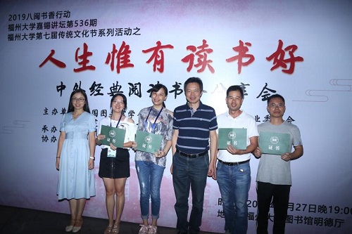9月27日晚,2019八闽书香行动:人生惟有读书好——中外经典阅读书香分享会在福州大学旗山校区图书馆明德厅举行,南京大学教授、博士生导师,中国阅读学研究会名誉会长徐雁教授;知名出版史专家、武汉大学教授、博士生导师吴永贵教授;南京市金陵图书馆主任,副研究馆员李海燕;北京大学博士,安徽大学教授刘洪权一行四人莅临我馆。