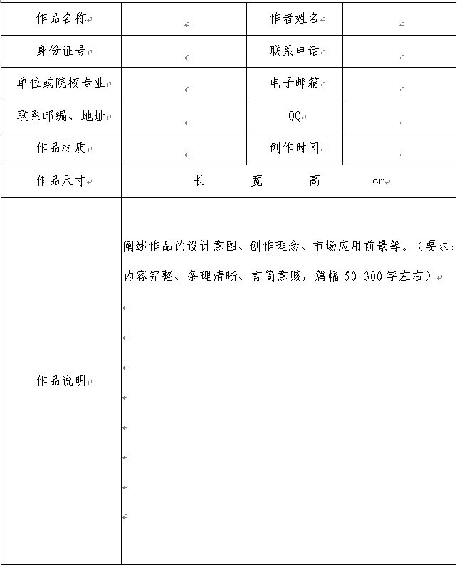 (5)作品需附作品说明,注明作品名称、作者姓名、身份证号、单位或院校专业、地址、邮编、电话、邮箱、作品材质、创作时间、作品尺寸(长×宽×高cm)等内容,阐述作品的设计意图、创作理念、市场应用前景等。(要求:内容完整、条理清晰、言简意赅,篇幅50-300字左右)