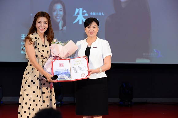 (福州大学直属单位党委书记、图书馆馆长刘敏榕为朱迅颁发福州大学嘉锡讲坛证书)