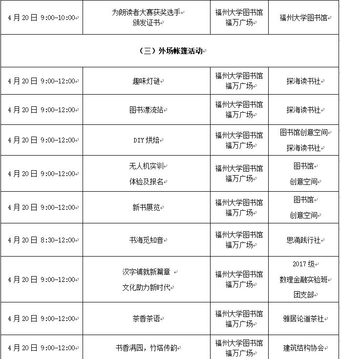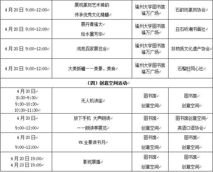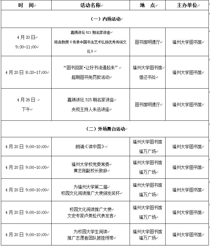 第24个“4·23世界读书日”即将来临,福州大学图书馆定于2019年4月20日9:00——12:00在福州大学图书馆,举办主题为“新时代·新阅读·新未来”大型阅读推广系列活动,为强化师生的人文素养,提升阅读鉴赏能力,图书馆以“天天4?23”为主线,充分发挥图书馆丰富馆藏资源与文化推广职能,展示与传播中华优秀传统文化,用创意点燃阅读的火花。我们希望通过活动引导大家寻找回热爱阅读的自我,寻找到创意阅读的新方式,力求通过举办读书日活动推进“全民阅读”,欢迎全校师生积极参与!希望带领各位阅读者寻找回热爱阅读的自我,走进图书馆,回归阅读。 时间:2019年4月20日9:00——12:00 地点:福州大学旗山校区图书馆福万广场 主办:福州大学图书馆 承办:读者服务与文化建设部、图书馆学生馆员联合会 、探海读书社、思涌践行社、非物质文化保护协会、丑石听潮书画社、建筑结构协会、石韵坊篆刻协会、雅居论道茶社、石榴籽同心社 附:活动安排表: 2019年福州大学图书馆“4·23世界读书日大型阅读推广活动”列表