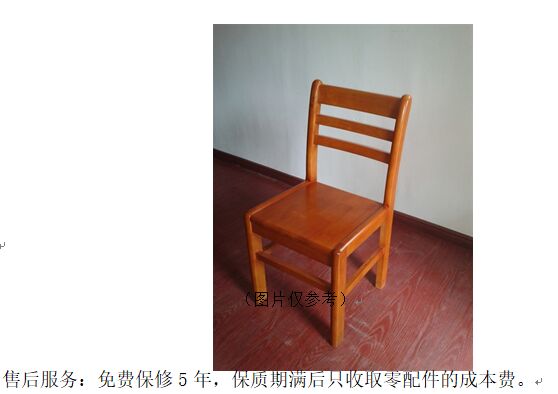 整体均采用优质橡胶木实木制作,椅面厚20mm,椅脚30mm*50mm,椅靠背厚20mm。木材经脱水、脱胶、防腐、防虫化学处理,无裂纹,缺口、虫洞,面板木纹纹理自然,颜色线条拼合细密,遇到潮湿或湿度较高情况不鼓起,不变形。胶粘剂采用进口原胶,性能可靠持久。表面采用高级环保耐磨漆,油漆采用五底三面工艺,环保油漆(颜色可根据客户要求定做)。光亮平整,无颗粒、汽泡、渣点、颜色均匀,持久耐磨。整体五金配件紧密拼接,封边细腻,线条均匀,转角过渡自然,间隙细小且均等。产品符合国家技术监督局家具生产技术标准,持久耐磨,摆放后无影响外观和使用性能的永久变形,各部位的安装牢固可靠,无松动、倾斜、摇晃等现象。