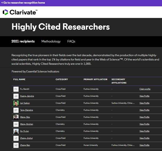 福州大学有9位学者入选该名单,位居福建省高校首位。具体入选情况如下:化学学院的王心晨教授、徐艺军教授和唐点平教授入选化学领域的全球高被引科学家,化学学院的付贤智院士、张金水教授、汪思波教授和张楠博士、石油化工学院的赖跃坤教授和黄剑莹副教授入选跨学科领域的全球高被引科学家。与2020年相比,新增两位学者,分别是唐点平教授和汪思波教授。