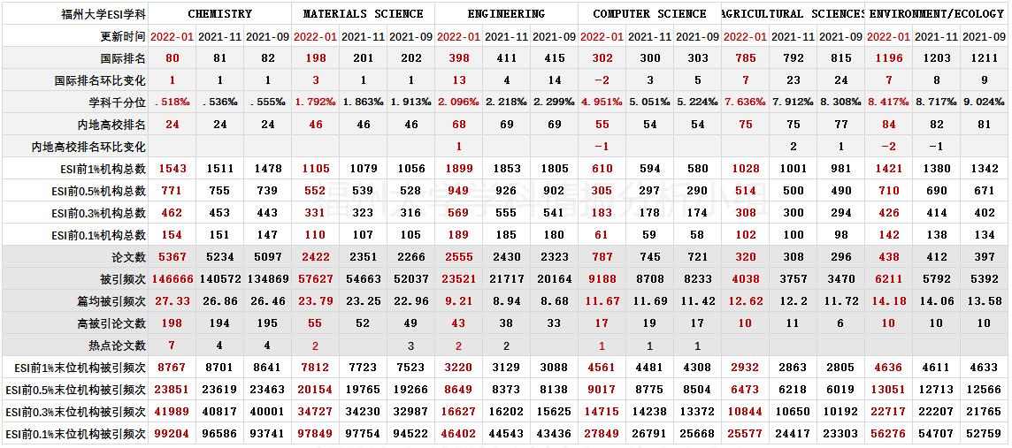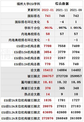 表 1福州大学ESI学科情况表 2福州大学ESI学科综合数据进展情报