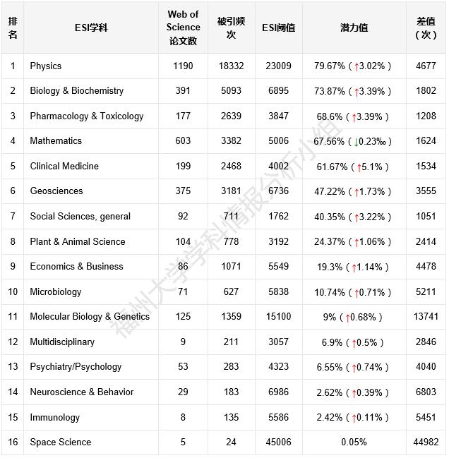 *注:1、Web of Science论文数和被引频次数据来源于InCites,ESI阈值数据来源于ESI。InCites更新时间2021年11月26日,统计时间跨度为2011年01月01日至 2021年10月31日;ESI更新时间2022年01月13日,统计时间跨度为2011年01月01日至 2021年10月31日。潜力值为被引频次占ESI阈值的百分比。2、表中的差值指的是福州大学被引频次与ESI学科阈值的差距。