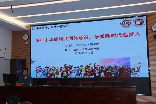 2018级环境与安全工程学院贾依达尔·巴合提别克同学通过图文并茂的PPT形式向同学们讲述民族团结好故事,介绍了自己在福州大学刘敏榕工作室成长经历。刘敏榕工作室作为福州大学少数民族学生的第二个家,时时洋溢欢声笑语、处处充满和谐温馨。少数民族同学们经常到工作室学习交流,它承载着太多老师对同学们的谆谆教导,也承载着学校对少数民族的关怀,更承载着国家对少数民族的希望。将民族团结深深地刻在同学们的心里。