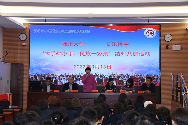 2022年3月13日上午,在福州大学刘敏榕工作室负责人、福州大学图书馆馆长刘敏榕老师的带领下,工作室师生一行10人前往长乐华侨中学开展“铸牢中华民族共同体意识”系列活动之一:“大手拉小手,民族一家亲”结对共建活动,华侨中学董钟惠书记、陈碧云校长对福州大学师生的到来表示热烈欢迎,本次活动近200名师生参加。