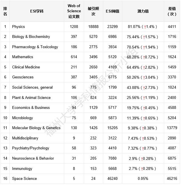 福州大学ESI潜力学科中,本期潜力值最高的是物理学学科,潜力值为81.07%,离ESI全球前1%还有一定的距离,其次是生物学与生物化学,详见