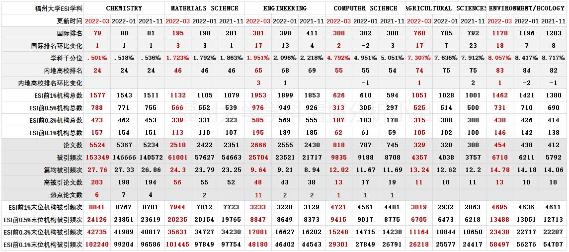 *注:1、Web of Science论文数和被引频次数据来源于InCites,ESI阈值数据来源于ESI。InCites更新时间2022年01月28日,统计时间跨度为2011年01月01日至 2021年12月31日;ESI更新时间2022年03月10日,统计时间跨度为2011年01月01日至 2021年12月31日。潜力值为被引频次占ESI阈值的百分比。2、表中的差值指的是福州大学被引频次与ESI学科阈值的差距。