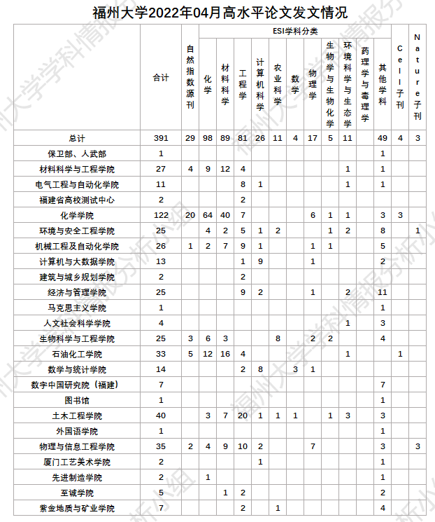 为了方便我校教学科研、科研管理等相关人员及时了解、跟踪本校高水平论文的收录情况,福州大学学科情报分析小组利用WoS数据库对近期作者单位为“福州大学”的论文进行了收集整理统计,更新时间为2022年04月30日。
