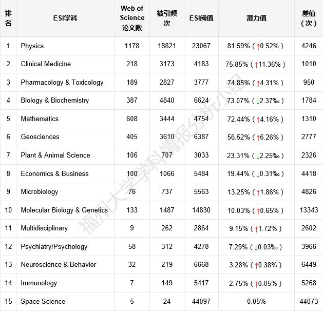 *注:1、Web of Science论文数和被引频次数据来源于InCites,ESI阈值数据来源于ESI。InCites更新时间2022年4月1日,统计时间跨度为2012年1月1日至 2022年3月12日;ESI更新时间为2022年5月12日,统计时间段为2012年1月1日至2022年2月28日。潜力值为被引频次占ESI阈值的百分比。2、表中的差值指的是福州大学被引频次与ESI学科阈值的差距。