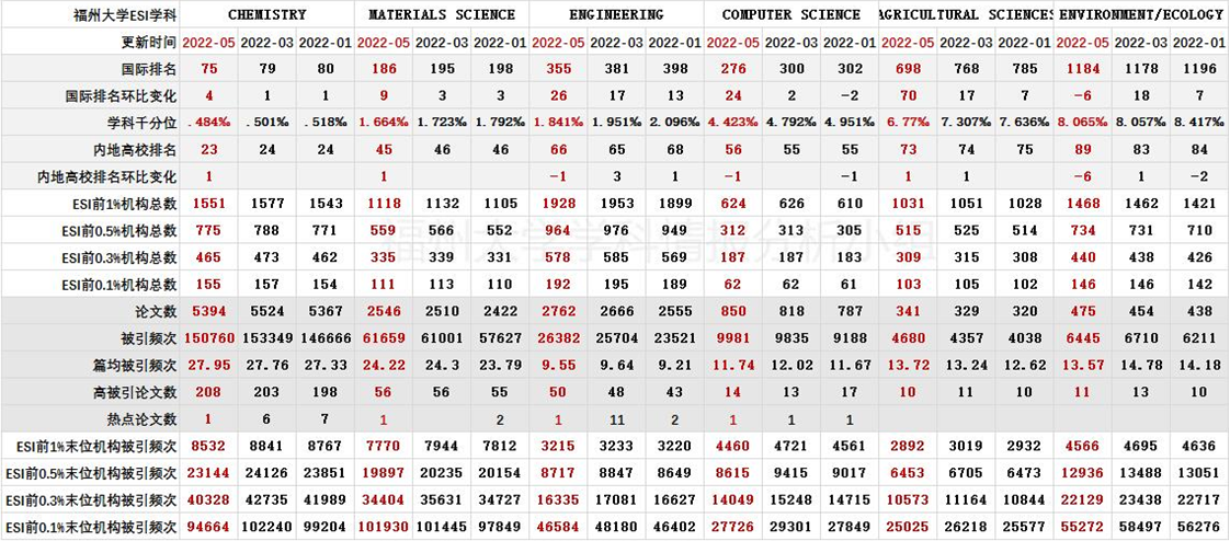 本期ESI数据显示,进入前1%的机构总数为7752,福州大学世界综合排名687位(与上一期数据相比,前进了48位),所处千分位为.886‰,内地高校排名56位(与上一期数据相比,前进了2位)。福州大学论文总数为15996篇,总被引频次为301709次,篇均被引频次为18.86次/篇,高被引论文394篇(与上一期数据相比,增加了3篇)。福州大学有6个学科进入ESI前1%,分别是:化学、材料科学、工程学、计算机科学、农业科学和环境生态学,详见表 1-表 3。