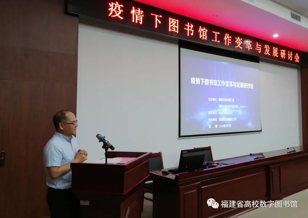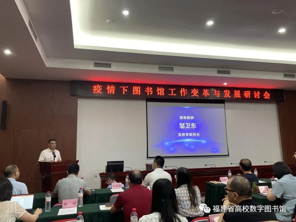 邹卫东首先代表龙岩学院对会议的召开表示热烈祝贺,并向各位与会领导和专家表示诚挚欢迎,向为会议召开付出辛勤劳动的工作人员表示衷心感谢!他表示,作为闽西红土地上的唯一本科院校,龙岩学院始终秉承“根植红土、致力应用、彰显特色、服务发展”办学理念,在人才培养、科学研究、服务社会、文化传承和创新等方面成绩斐然;龙岩学院图书馆依托省图工委和FULink平台,一直坚持“服务、特色、开放、共享”办馆理念,践行“供给侧优化及互联网+服务”,不断革新服务思路,强化信息资源共享,主动贴近教学科研需求,为学校的发展做出了积极贡献。能够承办此次会议,是主办方对龙岩学院图书馆的信任和肯定,学校全力支持。同时,希望与会领导和专家们围绕会议主题充分交流、积极分享,共同推动疫情下图书馆工作的转型与发展。