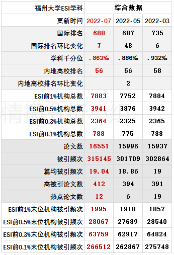 福州大学ESI学科综合数据进展情报