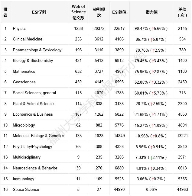*注:1、Web of Science论文数和被引频次数据来源于InCites,ESI阈值数据来源于ESI。InCites更新时间2022年07月29日,统计时间跨度为2012年01月01日至 2022年06月30日;ESI更新时间为2022年09月08日,统计时间段为2012年01月01日至2022年06月30日。潜力值为被引频次占ESI阈值的百分比。2、表中的差值指的是福州大学被引频次与ESI学科阈值的差距。