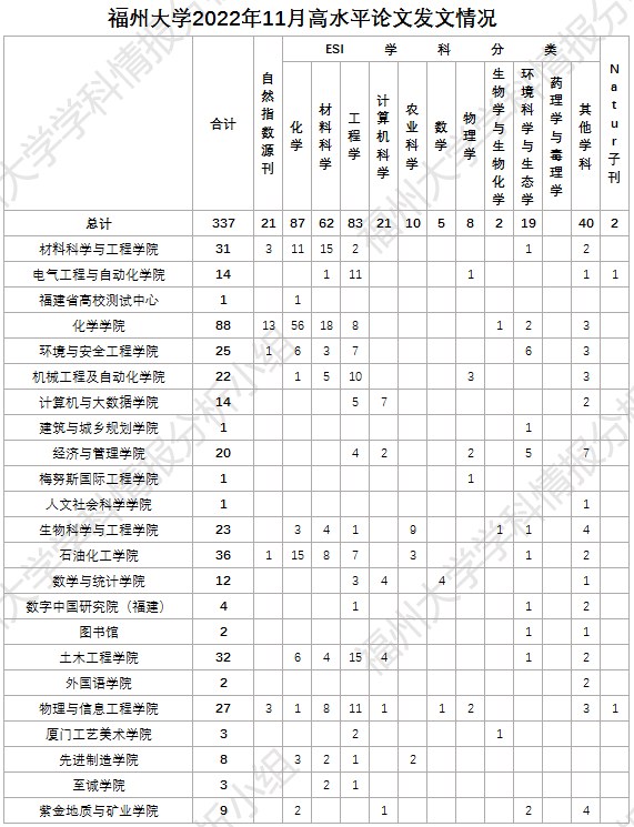 为了方便我校教学科研、科研管理等相关人员及时了解、跟踪本校高水平论文的收录情况,福州大学学科情报分析小组利用WoS数据库对近期作者单位为“福州大学”的论文进行了收集整理统计,更新时间为2022年12月01日。