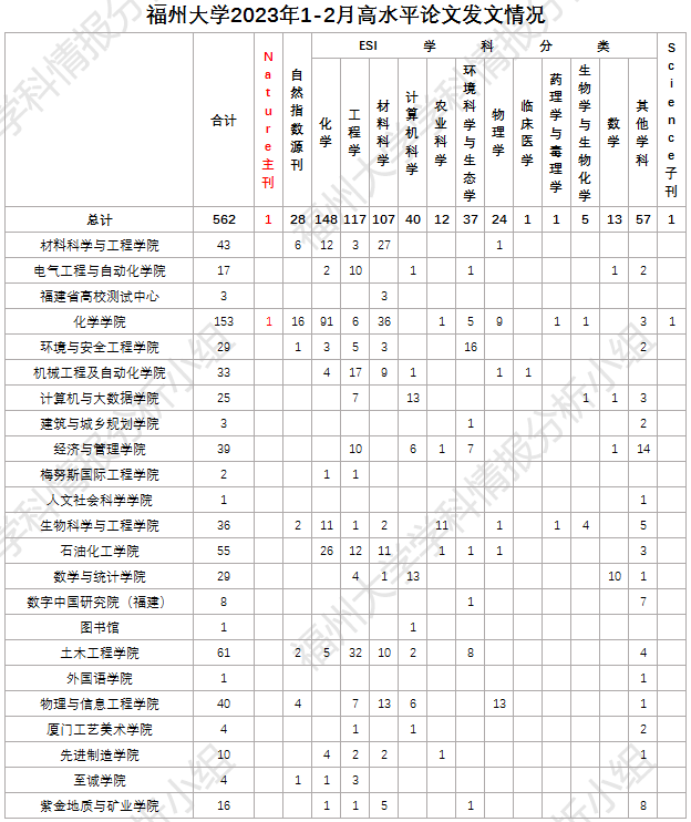 为了方便我校教学科研、科研管理等相关人员及时了解、跟踪本校高水平论文的收录情况,福州大学学科情报分析小组利用WoS数据库对近期作者单位为“福州大学”的论文进行了收集整理统计,更新时间为2023年03月01日。