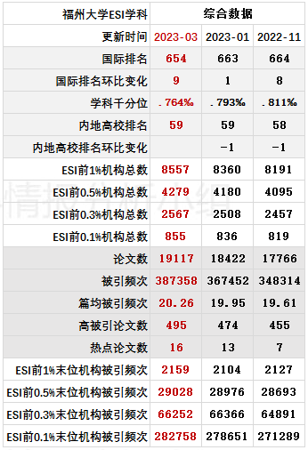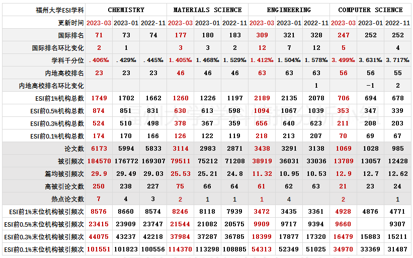 *注:1、Web of Science论文数和被引频次数据来源于InCites,ESI阈值数据来源于ESI。InCites更新时间2023年01月27日,统计时间跨度为2012年1月1日至 2022年12月31日;ESI更新时间为2023年3月9日,统计时间段为2012年1月1日至2022年12月31日。潜力值为被引频次占ESI阈值的百分比。2、表中的差值指的是福州大学被引频次与ESI学科阈值的差距。
