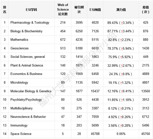 福州大学ESI潜力学科中,本期潜力值最高的是药理学与毒理学学科,潜力值为89.43%,离ESI全球前1%还有一定的距离,其次是生物学与生物化学,地球科学和社会科学总论学科进步较大,详见表 4。