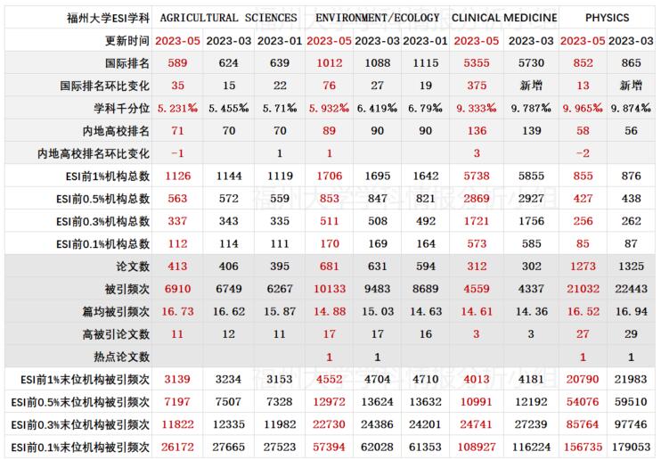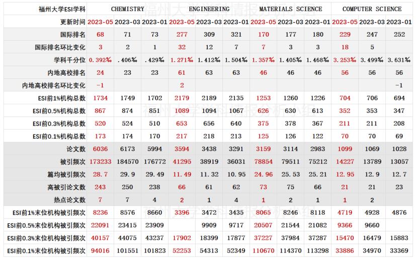 *注:1、Web of Science论文数和被引频次数据来源于InCites,ESI阈值数据来源于ESI。InCites更新时间2023年04月28日,统计时间跨度为2013年1月1日至 2023年3月31日;ESI更新时间为2023年5月11日,统计时间段为2013年1月1日至2023年2月28日。潜力值为被引频次占ESI阈值的百分比。2、表中的差值指的是福州大学被引频次与ESI学科阈值的差距。