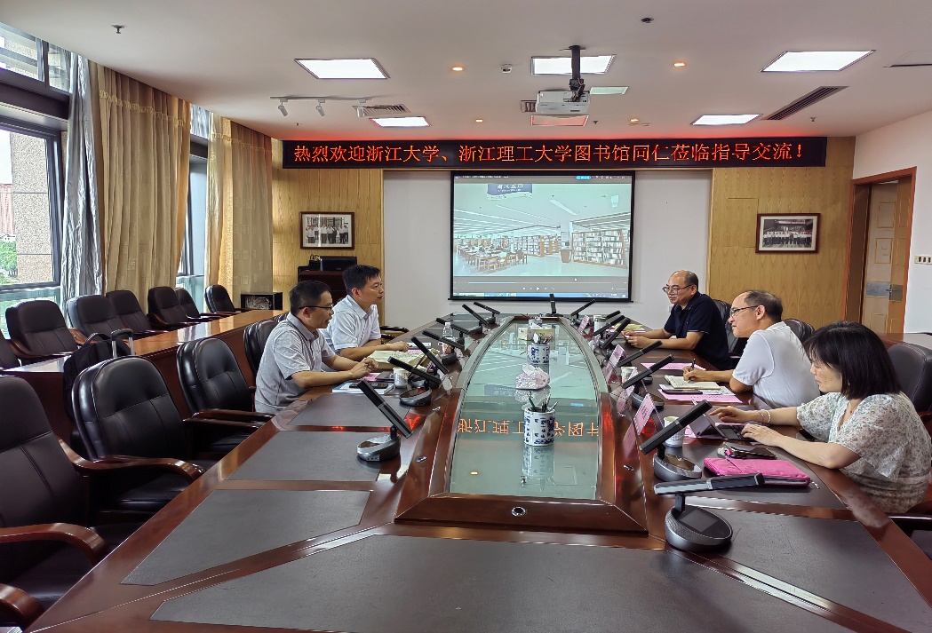 2023年7月26日下午,浙江大学图书馆余敏杰副馆长和浙江理工大学刘翔副馆长莅临福州大学图书馆调研。林熙阳副馆长、FULink副秘书长詹庆东、戴晓翔主任和黄维玲副主任进行了热情接待。