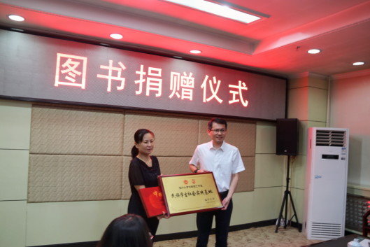 紧接着,北京人天书店集团股份有限公司董事长、北京蔚蓝公益基金会荣誉理事长邹进,为刘敏榕工作室负责人刘敏榕老师颁发荣誉证书,聘请刘敏榕老师为北京蔚蓝公益基金会高级志愿者,并联合福州大学向喀什市图书馆捐赠图书50万码洋。邹进董事长表示,将继续坚持“文化强疆,知识润疆”的理念,满足少数民族读者个性化、多元化阅读需求,丰富藏书量,用图书润疆,用知识兴疆。此外,福州大学还联合福州欣阅信息技术有限公司向喀什市图书馆捐赠60万种电子图书及管理平台。福州大学党委黄身勇副书记为喀什市图书馆授牌“福州大学刘敏榕工作室民族学生社会实践基地”,双方将在今后展开更广泛、更深入的合作。
