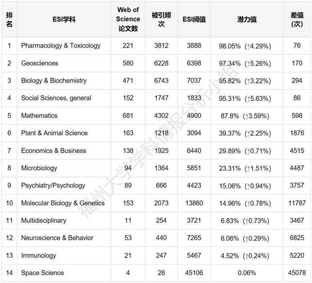 福州大学ESI潜力学科中,本期潜力值最高的是药理学与毒理学学科,潜力值为98.05%,其次是地球科学和生物学与生物化学,社会科学总论学科进步较大,详见表 4。