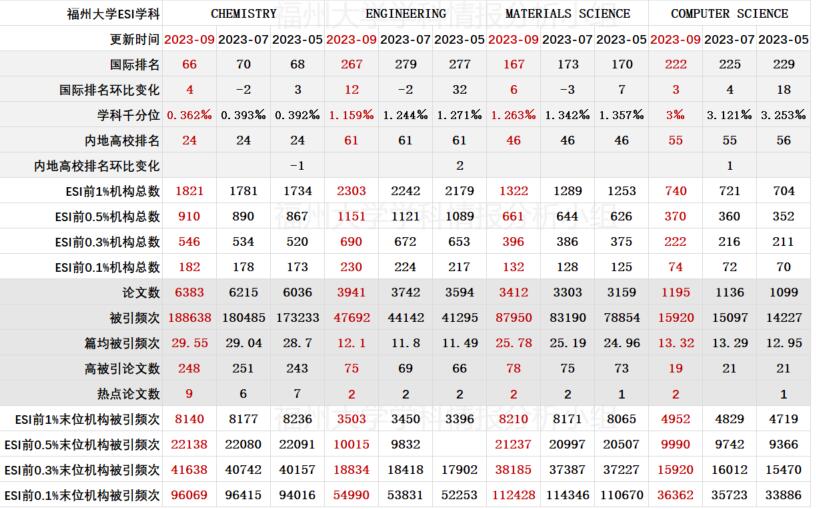 *注:1、Web of Science论文数和被引频次数据来源于InCites,ESI阈值数据来源于ESI。InCites更新时间2023年07月28日,统计时间跨度为2013年1月1日至 2023年6月30日;ESI更新时间为2023年9月15日,统计时间段为2013年1月1日至2023年6月30日。潜力值为被引频次占ESI阈值的百分比。2、表中的差值指的是福州大学被引频次与ESI学科阈值的差距。