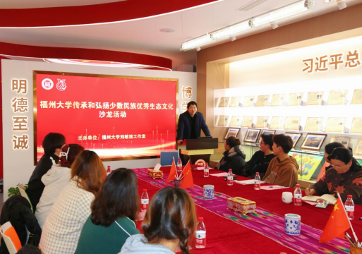 12月29日晚,福州大学刘敏榕工作室在福建省民族学生教育管理服务研究基地开展传承和弘扬少数民族优秀生态文化的沙龙活动。福州大学图书馆馆长刘敏榕老师、工作室相关负责老师及三爱读书社成员,福州大学马克思主义学院副教授、中国环境科学学会生态环境科普专家库成员刘志坚老师等共30人共同参与此次沙龙活动。