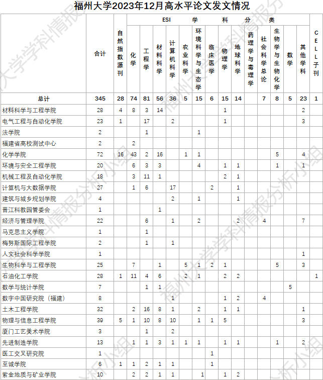 为了方便我校教学科研、科研管理等相关人员及时了解、跟踪本校高水平论文的收录情况,福州大学学科情报分析小组利用WoS数据库对近期作者单位为“福州大学”的论文进行了收集整理统计,更新时间为2023年12月31日。